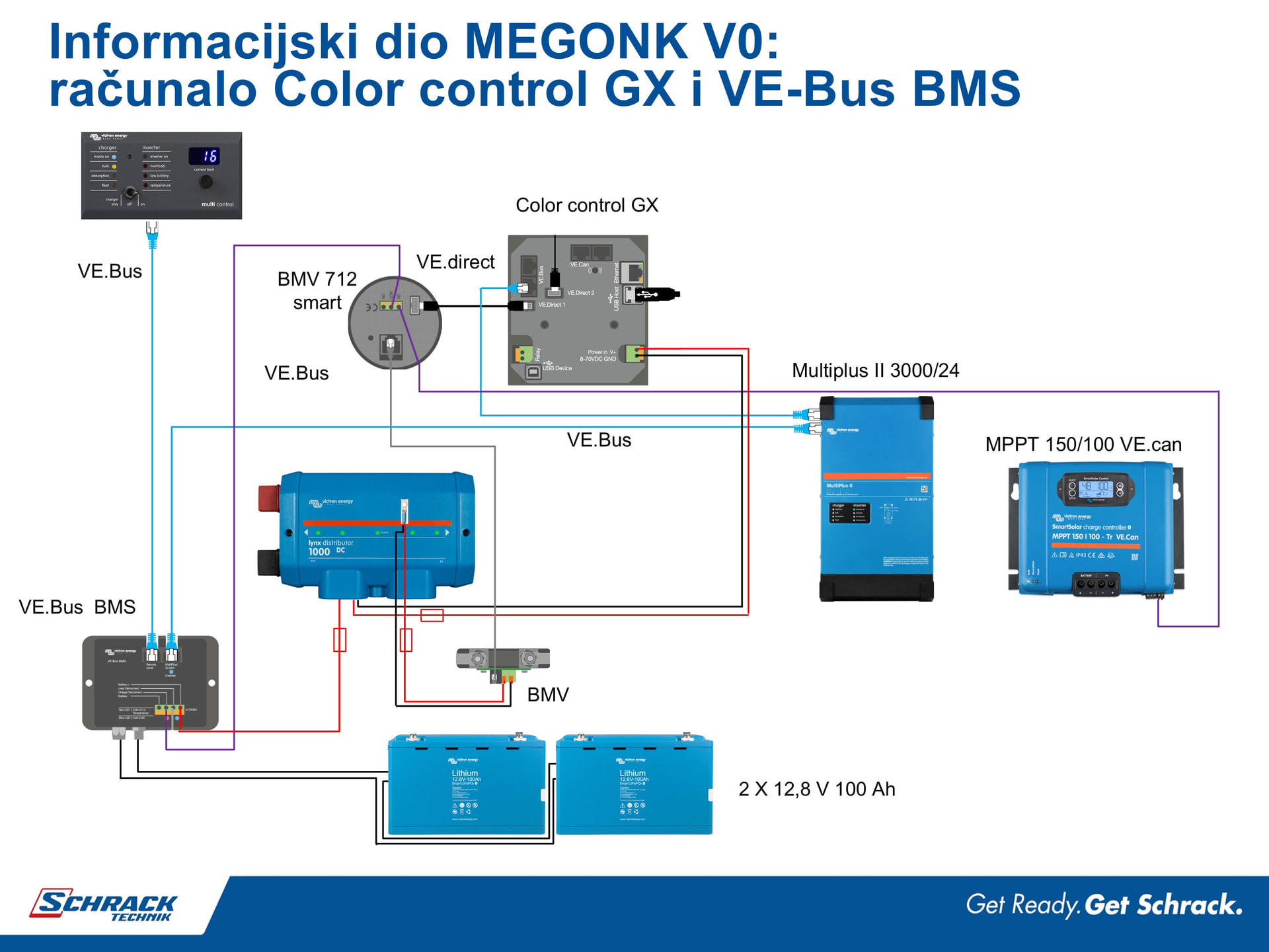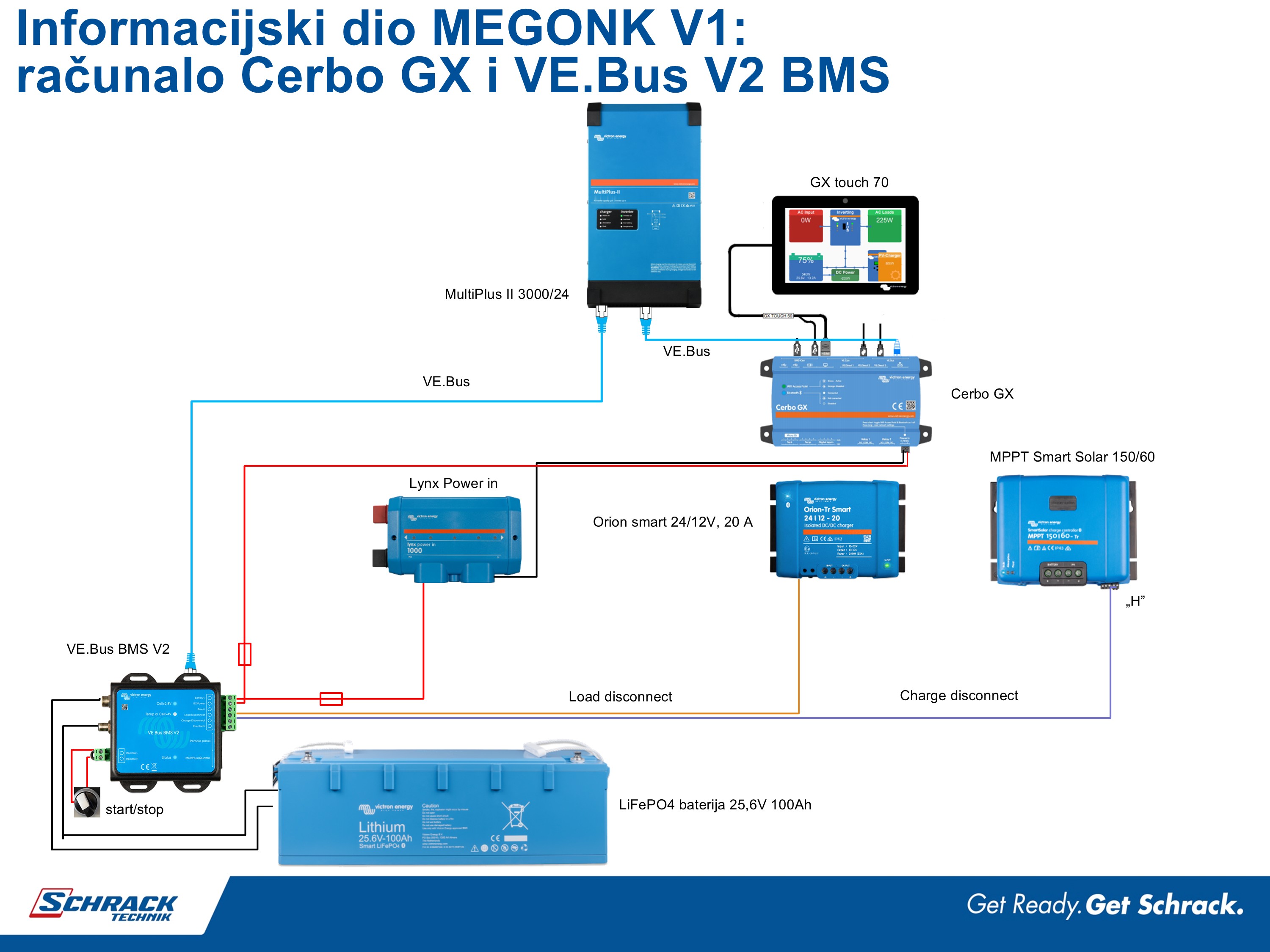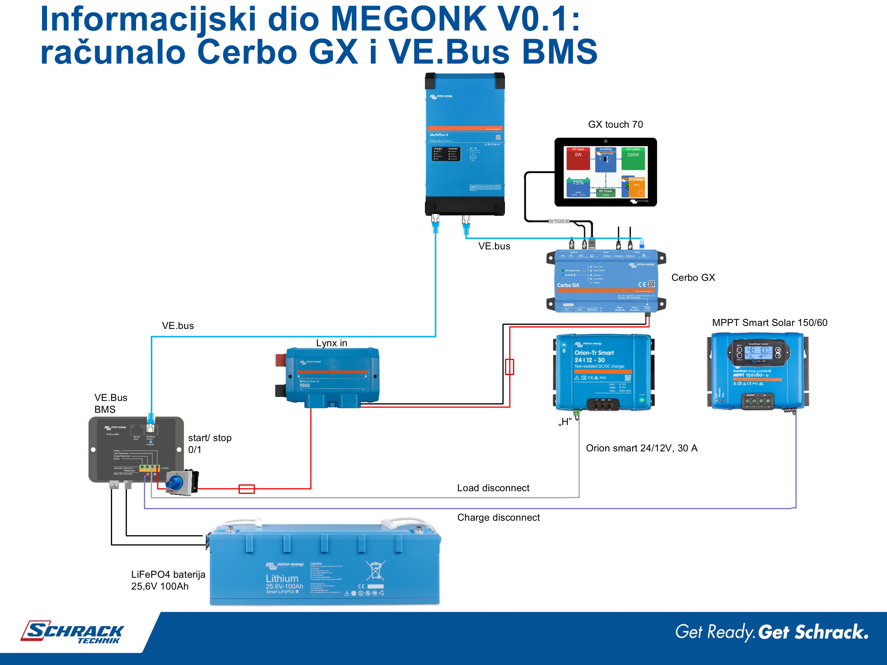 Aktualna verzija MEGONK V 1.0 ima 24 V LFP bateriju, nadzorno računalo Cerbo GX, i novi VE.bus BMS V2 i također se spaja jednofazno na mrežu.